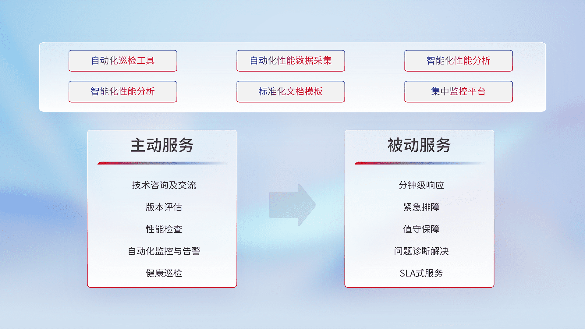 智能化工具和标准化文档,,保障服务质量,,,,提供主动服务(包含技术咨询、、版本评估、、性能检查、、、、自动化监控与告警、、、、健康巡检)和被动服务包含(分钟级响应、、、、紧急排障、、值守保障、、、、问题诊断解决、、、SLA服务)。。